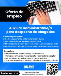 👉 Si te interesa, inscríbete a través de nuestra Agencia de Colocación y sube tu CV a: AUXILIAR ADMINISTRATIVO/A PARA DESPACHO DE ABOGADOS